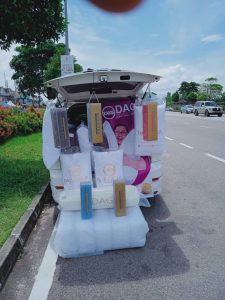 Aktiviti Anoy menjalankan perniagaan bantal secara CBS di Pasir Gudang.