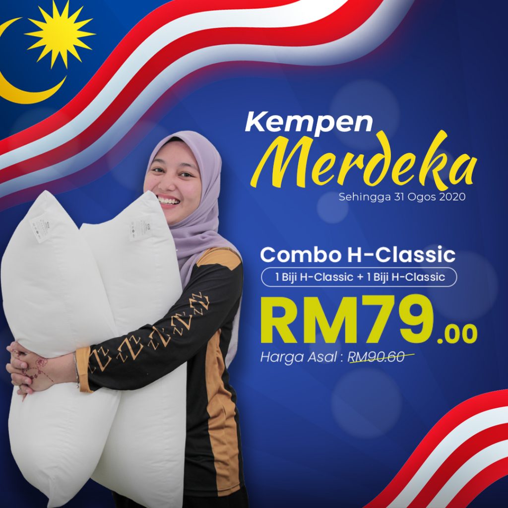 Selain itu, kempen kemerdekaan ini juga menawarkan combo H-Class Pro dengan harga RM97 sahaja untuk dua biji bantal H- Class Pro (harga asal RM126) manakala bagi combo bersama H-Classic pula harga yang ditawarkan adalah RM88 sahaja berbanding harga asal RM108.30.