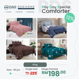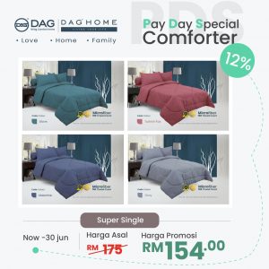 Menampilkan lebih 10 set comforter dengan pilihan pelbagai tema dengan diskaun sebanyak 12% bermula hari ini hingga 30 Jun sahaja!